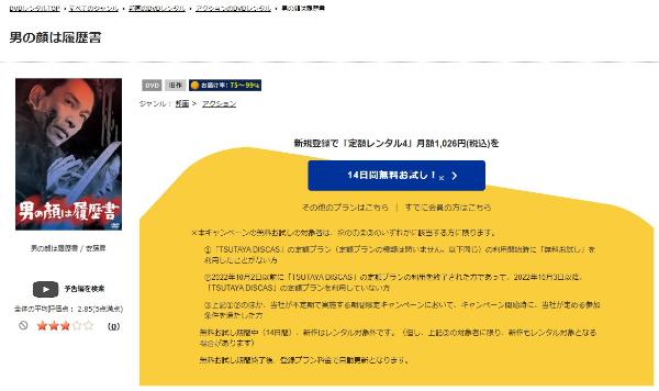 そして、映画「男の顔は履歴書」はツタヤディスカスで配信しているので、無料でDVDレンタルが可能です。