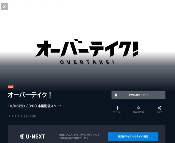 先に結論をお伝えすると、2023年10月1日から放送のアニメ「オーバーテイク!」は、2024年11月現在『U-NEXT』の動画配信サイトで1話から最終話(12話)まで配信中です。