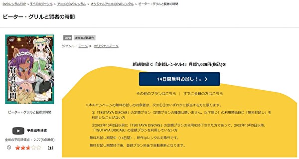 TSUTAYA DISCASは、準新作は8枚まで、話題作・旧作は枚数制限なしでお試し期間中に無料レンタルができ「ピーター・グリルと賢者の時間」のアニメは、話題作なので無料視聴可能です。