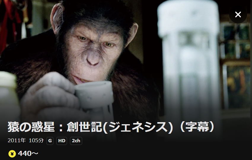 映画「猿の惑星:創世記(ジェネシス)」は330円でレンタル配信してるので、フルで視聴できます。