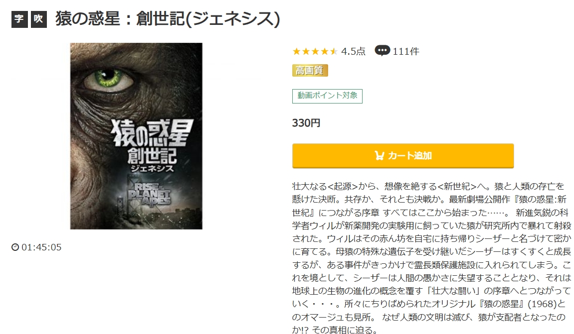 初回登録時に550円分のポイントがもらえるので、440円で配信されている映画「猿の惑星:創世記(ジェネシス)」は、フルで視聴することができます。