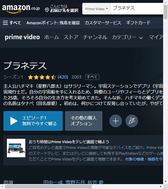 人気の動画配信サイトAmazonプライムでも、アニメ「プラネテス」を視聴できるか調査しました。