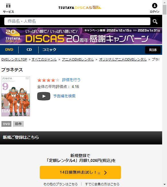 TSUTAYA DISCASは、新作を除くDVDを8枚までお試し期間中に無料レンタルができ「プラネテス」のアニメは、旧作なので無料視聴可能です。