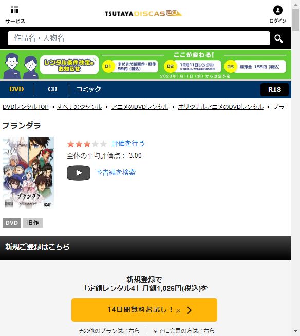 TSUTAYA DISCASは、準新作は8枚まで、話題作・旧作は枚数制限なしでお試し期間中に無料レンタルができ「プランダラ」のアニメは、旧作なので無料視聴可能です。