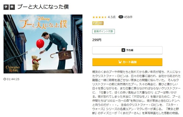 映画「プーと大人になった僕」は299円でレンタル配信してるので、フルで視聴できます。