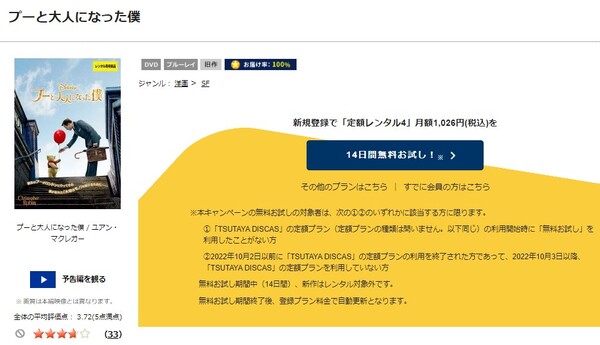 『TSUTAYA DISCAS』は14日間のお試し期間が初回特典で利用できるので「プーと大人になった僕」の動画をフルで無料視聴できますよ。