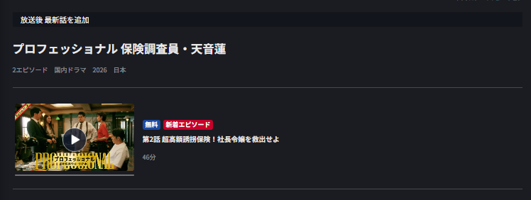 2026年1月8日(木)から放送スタートのドラマ「プロフェッショナル 保険調査員・天音蓮」の動画を見逃し配信で視聴できる配信サイトを紹介します。