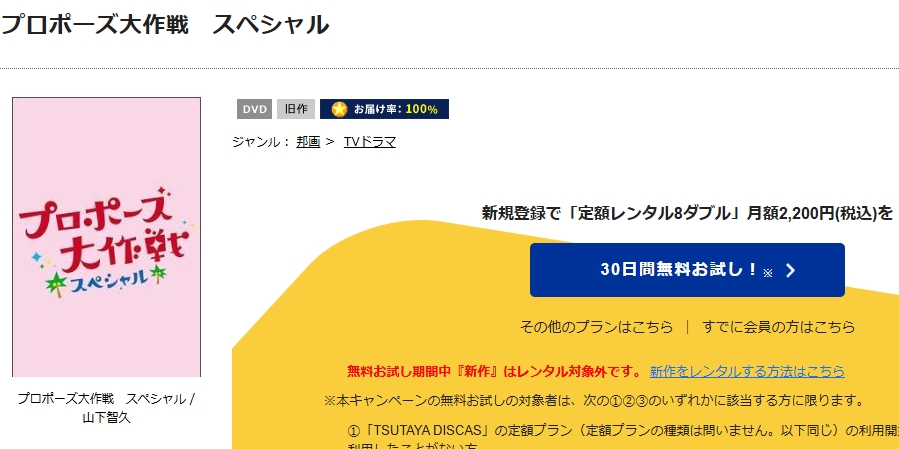 『TSUTAYA DISCAS』は初回登録限定で無料お試し期間があるため、その期間を利用すれば、ドラマ「プロポーズ大作戦 スペシャル」を実質無料でフル視聴できますよ。