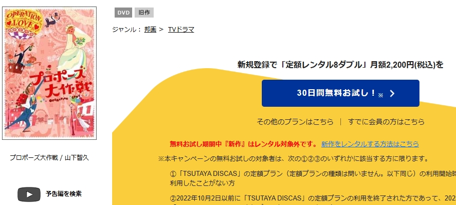 『TSUTAYA DISCAS』は初回登録限定で無料お試し期間があるため、その期間を利用すれば、ドラマ「プロポーズ大作戦」を実質無料で全話視聴できますよ。