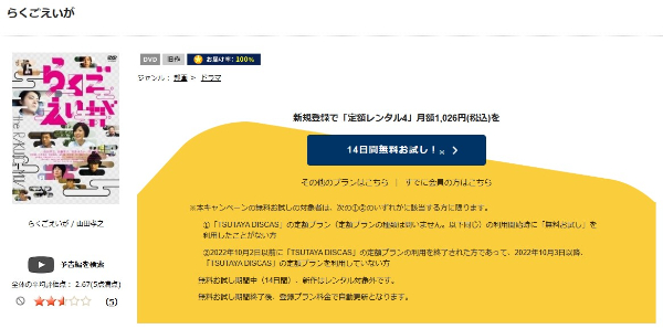 『TSUTAYA DISCAS』は14日間のお試し期間が初回特典で利用できるので「らくごえいが 「ライフ・レート」」の動画をフルで無料視聴できますよ。