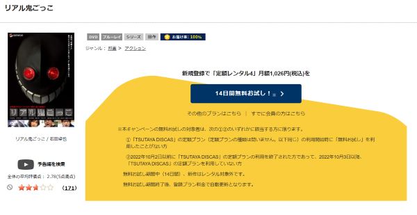 お試し期間が30日間なので、映画「リアル鬼ごっこ」の動画や関連動画も含め、TSUTAYA DISCASなら自分のペースでゆっくり視聴できます。