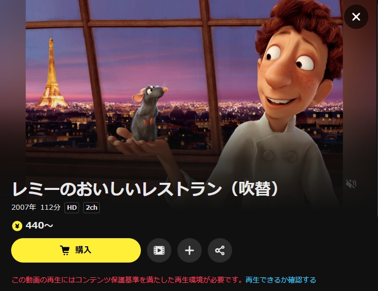 2026年3月現在、DMM TVでは「レミーのおいしいレストラン」の動画が動画が配信されており、440円で購入できます。