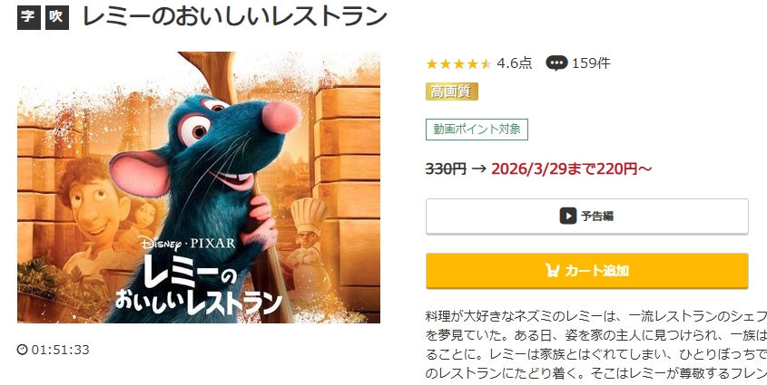 初回登録時に1,600円分のポイントがもらえるので、2026年3月29日まで220ポイントでレンタル配信している映画「レミーのおいしいレストラン」は無料で視聴できます。
