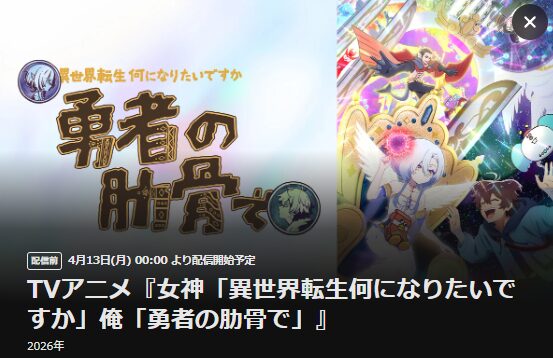 2026年4月7日(火)から放送スタートのアニメ「女神「異世界転生何になりたいですか」 俺「勇者の肋骨で」」の配信を全話視聴できる動画配信サービスを紹介します。
