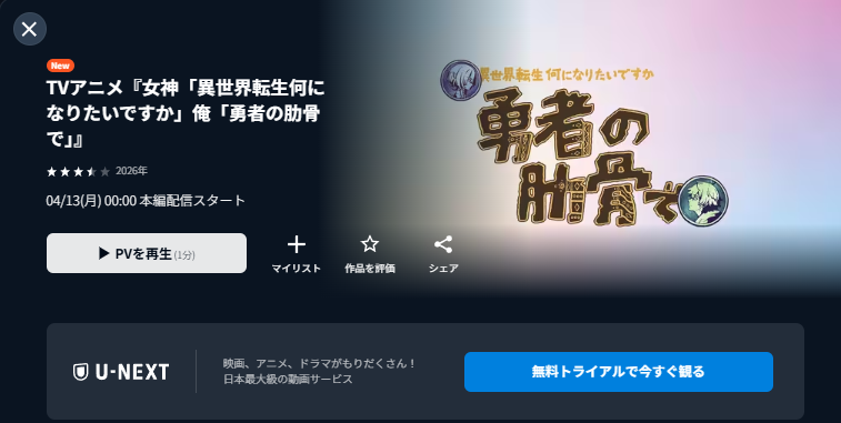 先に結論をお伝えすると、「女神「異世界転生何になりたいですか」 俺「勇者の肋骨で」」は、動画配信サービス『U-NEXT』で配信予定です。