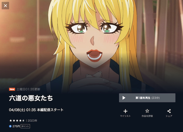 アニメ「六道の悪女たち」は1話視聴に275円かかります。