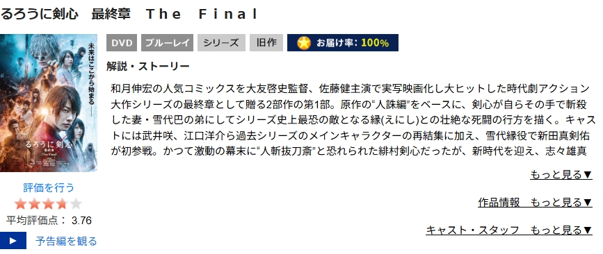 TSUTAYA DISCASで映画「るろうに剣心 最終章 The Final」をDVDレンタルしてフル視聴
