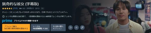 Amazonプライムビデオは、30日間のお試し無料期間があり「猟奇的な彼女」の映画をフルで視聴することができます。