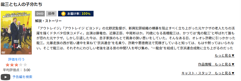 上記の配信一覧の通り、TSUTAYA DISCASのDVDレンタルサービスを使って龍三と七人の子分たちの映画を視聴できます。