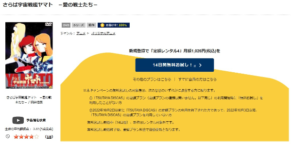 そして、映画「さらば宇宙戦艦ヤマト 愛の戦士たち」はツタヤディスカスで配信しているので、無料でDVDレンタルが可能です。