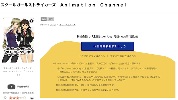 TSUTAYA DISCASは、準新作は8枚まで、話題作・旧作は枚数制限なしでお試し期間中に無料レンタルができ「スクールガールストライカーズ Animation Channel」のアニメは、旧作なので無料視聴可能です。