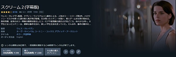 映画「スクリーム2」は299円でレンタル配信してるので、フルで視聴できます。