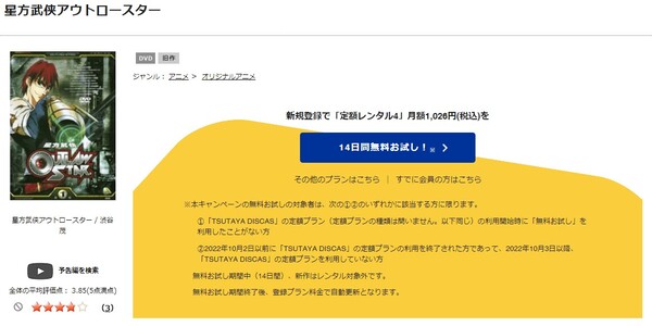TSUTAYA DISCASは、準新作は8枚まで、話題作・旧作は枚数制限なしでお試し期間中に無料レンタルができ「星方武侠アウトロースター」のアニメは、旧作なので無料視聴可能です。