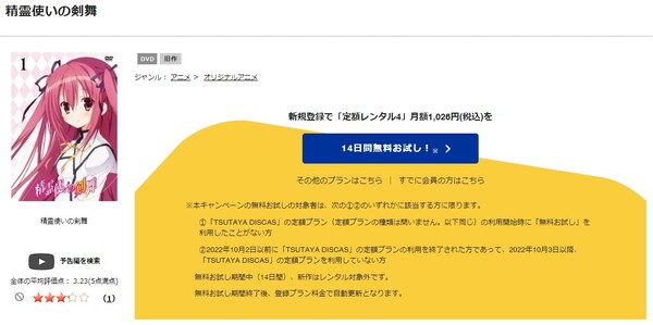 TSUTAYA DISCASは、準新作は8枚まで、話題作・旧作は枚数制限なしでお試し期間中に無料レンタルができ「精霊使いの剣舞」のアニメは、旧作なので無料視聴可能です。