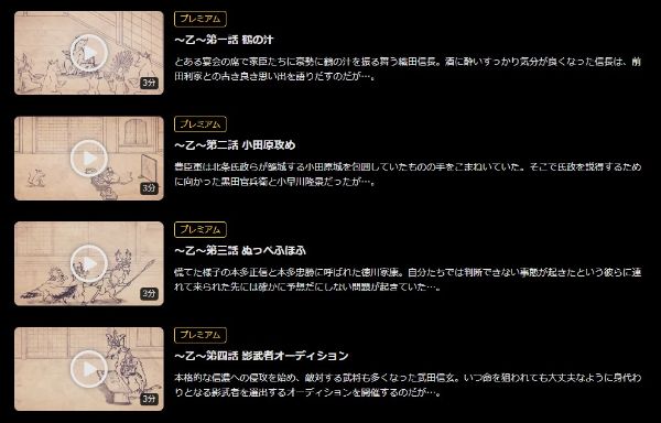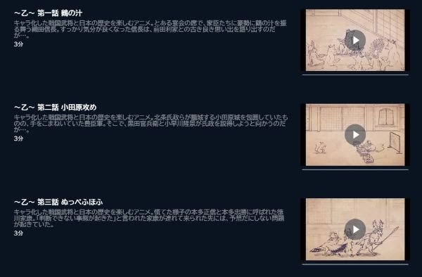 しかし、Amazonプライムはアニメ「戦国鳥獣戯画~乙~」の動画は視聴できませんが、関連動画やシリーズ作品の中には見放題で配信されているものがあります。