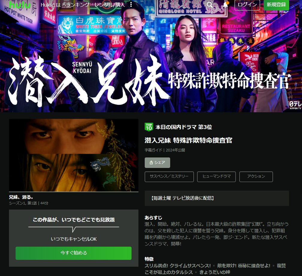 Huluでは「潜入兄妹 特殊詐欺特命捜査官」のドラマが見放題配信の対象作品になっているので、全話見放題で視聴できます。