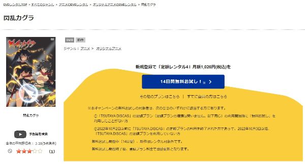 TSUTAYA DISCASは、準新作は8枚まで、話題作・旧作は枚数制限なしでお試し期間中に無料レンタルができ「閃乱カグラ」のアニメは、旧作なので無料視聴可能です。