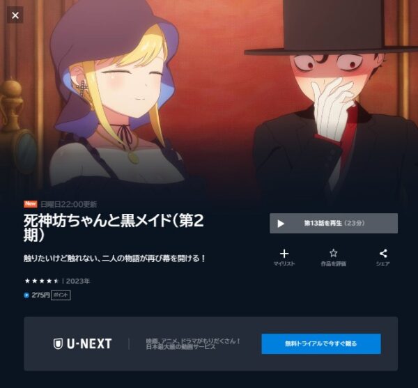 初回お試し期間が30日間あり、アニメ「死神坊ちゃんと黒メイド 2期」の配信もあり、13話から最新話(24話)まで見ることができます