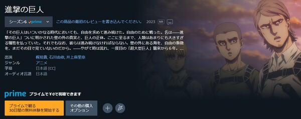 Amazonプライムでも、アニメ「進撃の巨人 The Final Series 完結編(前編)」は見放題で配信されており、30日間の無料期間があるので、余裕を持って「進撃の巨人 The Final Series 完結編(前編)」のアニメを全話視聴ができます。