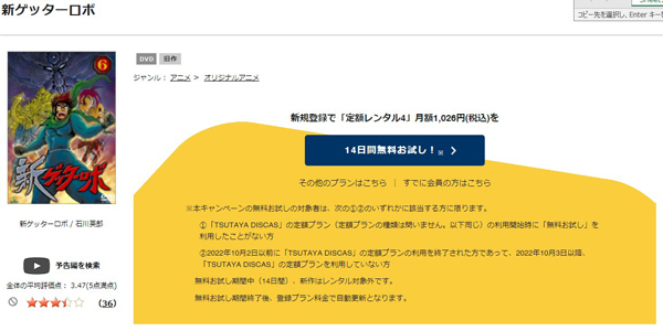 TSUTAYA DISCASは、準新作は8枚まで、話題作・旧作は枚数制限なしでお試し期間中に無料レンタルができ「新ゲッターロボ」のアニメは、旧作なので無料視聴可能です。