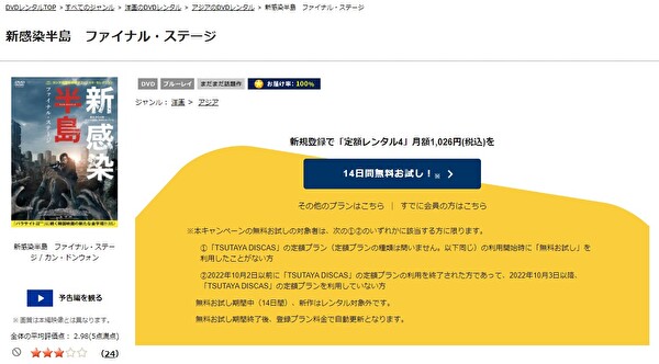 そして、映画「新感染半島 ファイナル・ステージ」はツタヤディスカスで配信しているので、無料でDVDレンタルが可能です。
