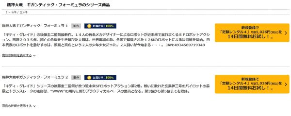 動画配信サービスとは少し違い、DVDレンタルサービスになりお試し期間で、「機神大戦 ギガンティック・フォーミュラ」の動画を全話視聴することができます。