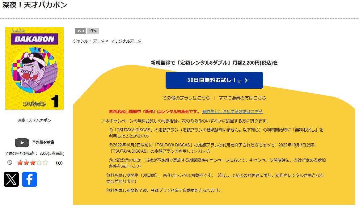 TSUTAYA DISCASで「深夜!天才バカボン」のDVDを全話視聴