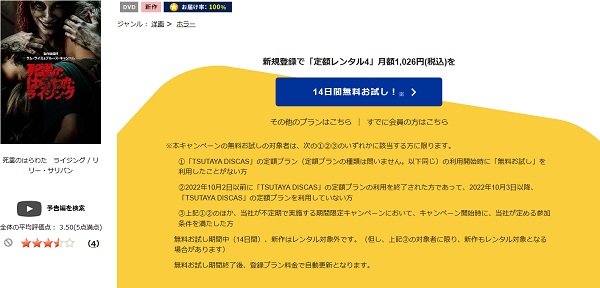 ただ、「死霊のはらわた ライジング」は配信しているのですが、TSUTAYA DISCASでは新作作品扱いなので、無料レンタル視聴することができません。