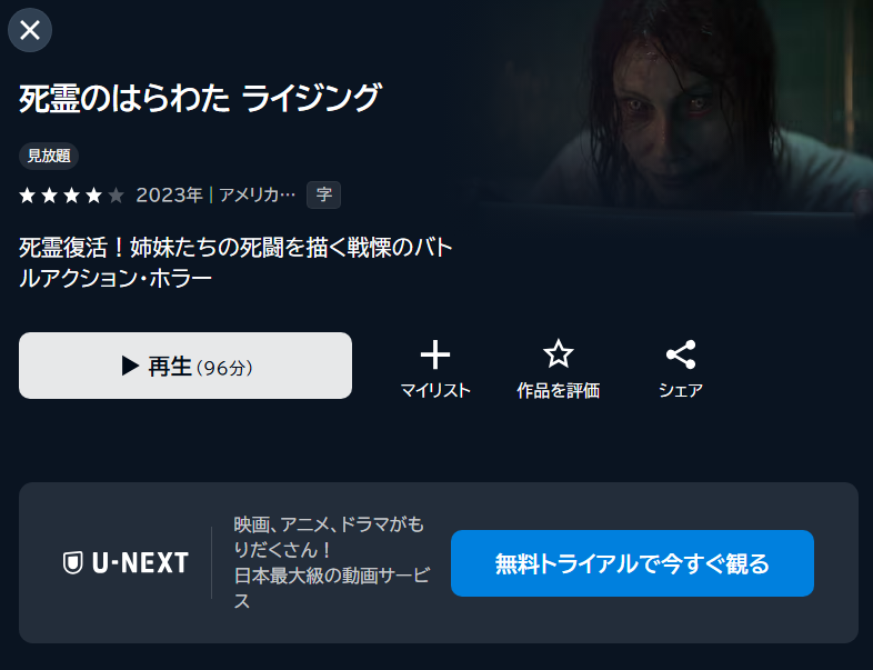よりお得に見たいという方には、初回31日間の無料トライアルがあるU-NEXTがおすすめです。無料期間を利用すれば、追加料金なしで映画「死霊のはらわた ライジング」を楽しめますよ。