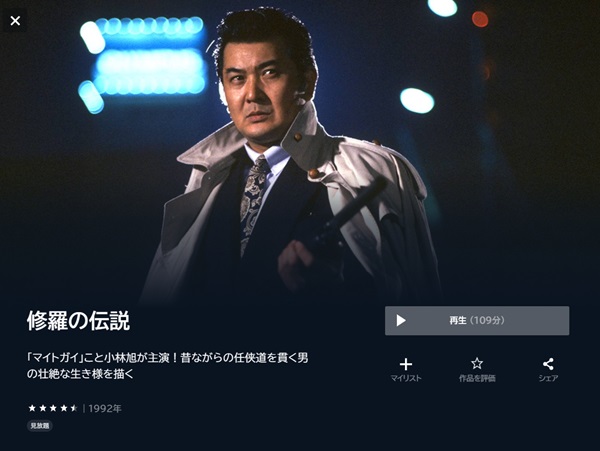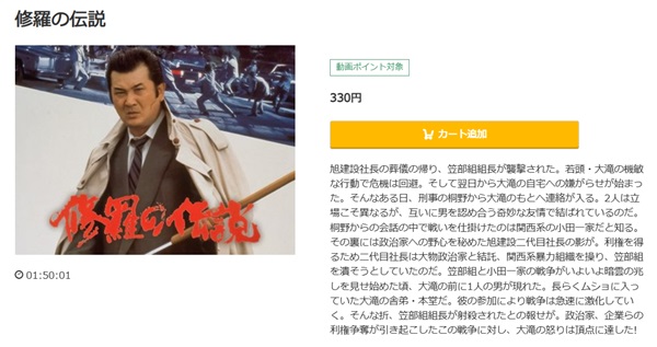 映画「修羅の伝説」は330円でレンタル配信してるので、フルで視聴できます。