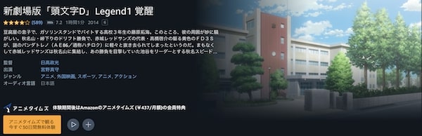 Amazonプライムビデオで、映画「 新劇場版 頭文字[イニシャル]D Legend 1 -覚醒-」をフルで視聴して他のアニメやアニメ映画、ドラマから映画まで見放題でフル視聴できる動画は沢山あります。