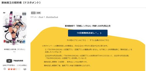 TSUTAYA DISCASは、準新作は8枚まで、話題作・旧作は枚数制限なしでお試し期間中に無料レンタルができ「新妹魔王の契約者(1期)」のアニメは、旧作なので無料視聴可能です。