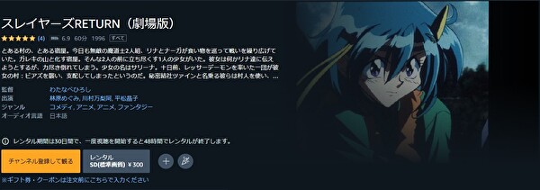 しかし、Amazonプライムビデオは無料期間が30日間ありますが、「スレイヤーズRETURN」の映画はレンタル作品で300円かかってしまうため無料視聴することができません。