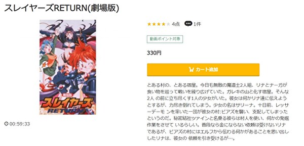 初回登録のみmusic.jpでは1,600Ptが貰えるので「スレイヤーズRETURN」の映画をフルで見ることができます。