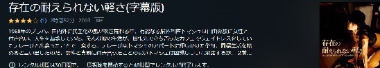 人気の動画配信サービスのAmazonプライムビデオで映画「存在の耐えられない軽さ」の映画がフルで視聴できるか調査しました。