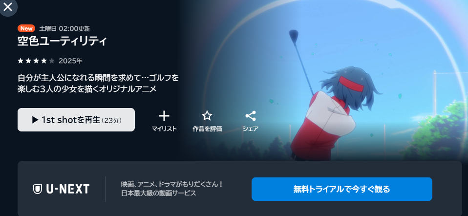 また、アニメ「空色ユーティリティ」のような人気ゴルフニメの「オーイ!とんぼ」「BIRDIE WING -Golf Girls’ Story- Season 2」もU-NEXTは楽しめます。