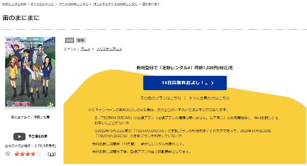 TSUTAYA DISCASは、準新作は8枚まで、話題作・旧作は枚数制限なしでお試し期間中に無料レンタルができ「宙のまにまに」のアニメは、旧作なので無料視聴可能です。