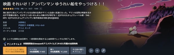 しかし、Amazonプライムビデオは無料期間が30日間ありますが、「それいけ!アンパンマン ゆうれい船をやっつけろ!!」の映画はレンタル作品で100円かかってしまうため無料視聴することができません。