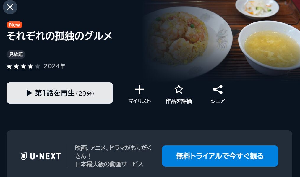 先に結論をお伝えすると、「それぞれの孤独のグルメ」は、『U-NEXT』の動画配信サイトで無料トライアル期間中に全話視聴が可能です。