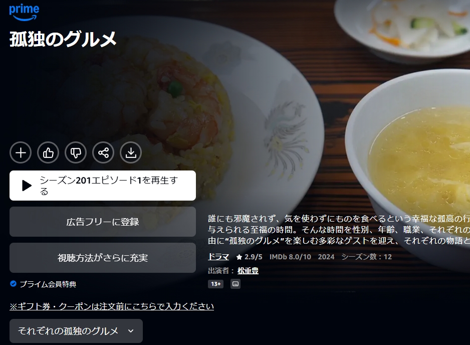 Amazonプライムでドラマ「それぞれの孤独のグルメ」の配信を全話見放題